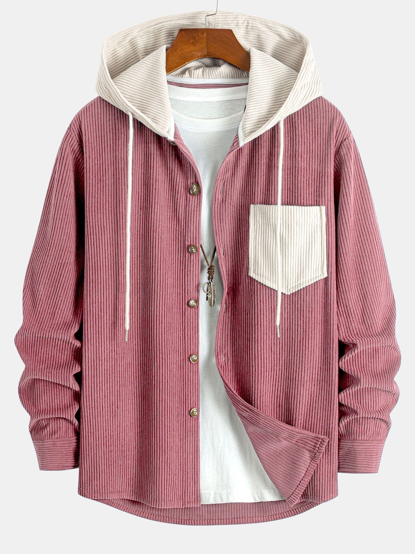 Contrast Corduroy Hooded Shirt with Long Sleeves